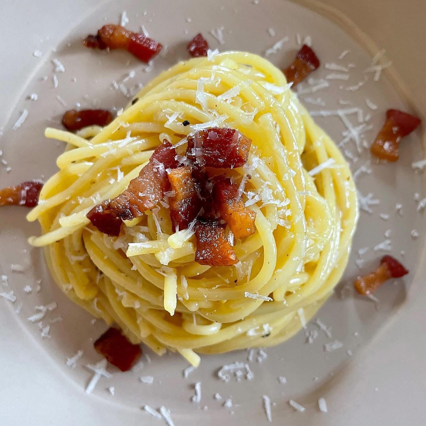 Pasta carbonara hails from Rome and dates back to the middle of the 20th century. It is traditionally made with spaghetti however, fettuccine, rigatoni, linguine, or bucatini can also be used. Carbonara seems to be one of the cousins in the Roman family circle of pastas that includes pasta alla gricia and caccio e pepe.