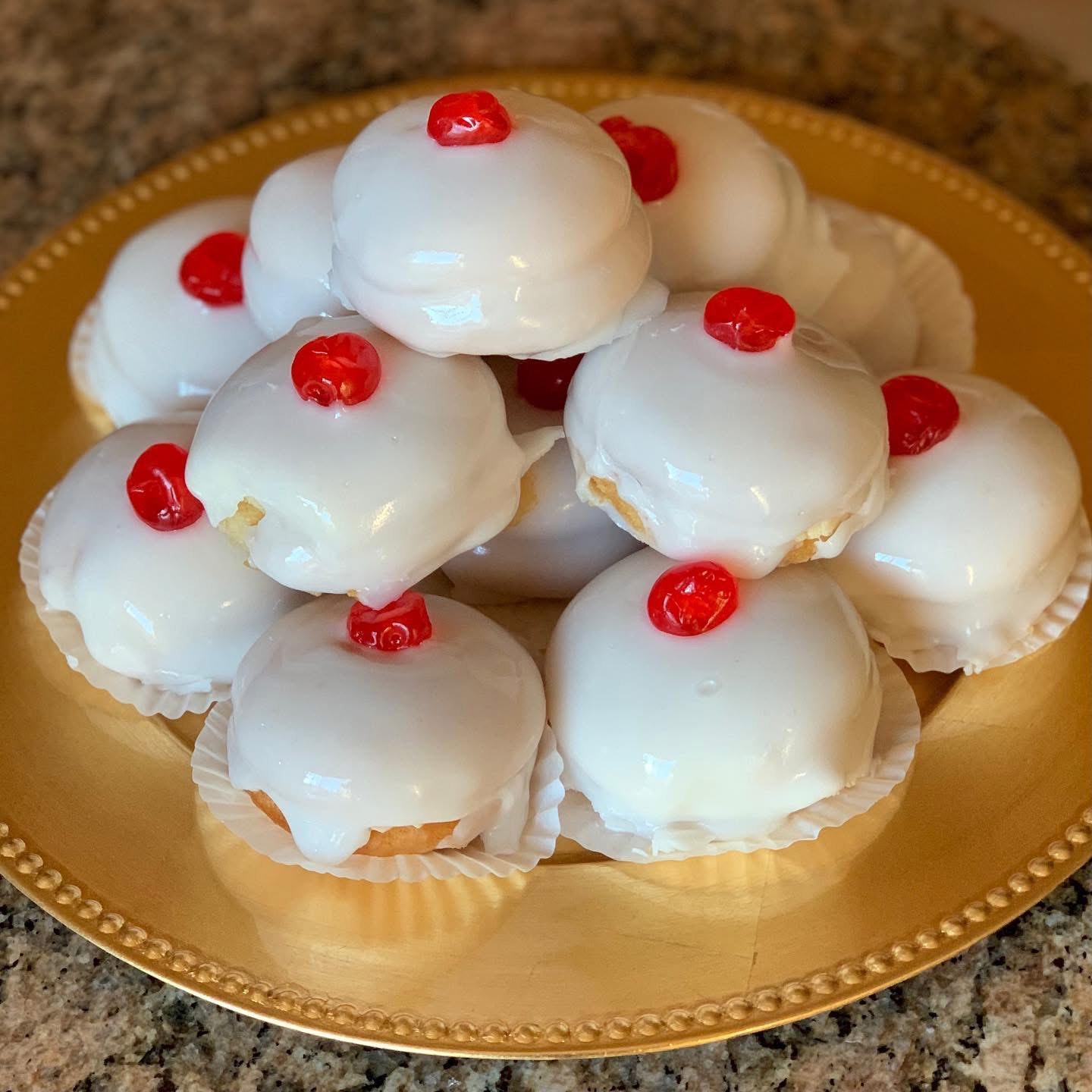 As the patron of Catania, Sicily, she is venerated every year, and part of the celebration includes partaking in a pastry known as Minne di Sant’Agata (Saint Agatha’s Breasts) or Minnuzzi ‘i sant’Àjita in Sicilian dialect. They are small, dome-shaped cakes designed to represent breasts. They are soft sponge cakes soaked in liquor, filled with sweet sheep’s milk ricotta, dark chocolate chips, and often diced candied fruit (citron or orange). The cakes are covered in white icing or marzipan and then topped with a candied cherry (to represent a nipple) and are typically eaten in event numbers.