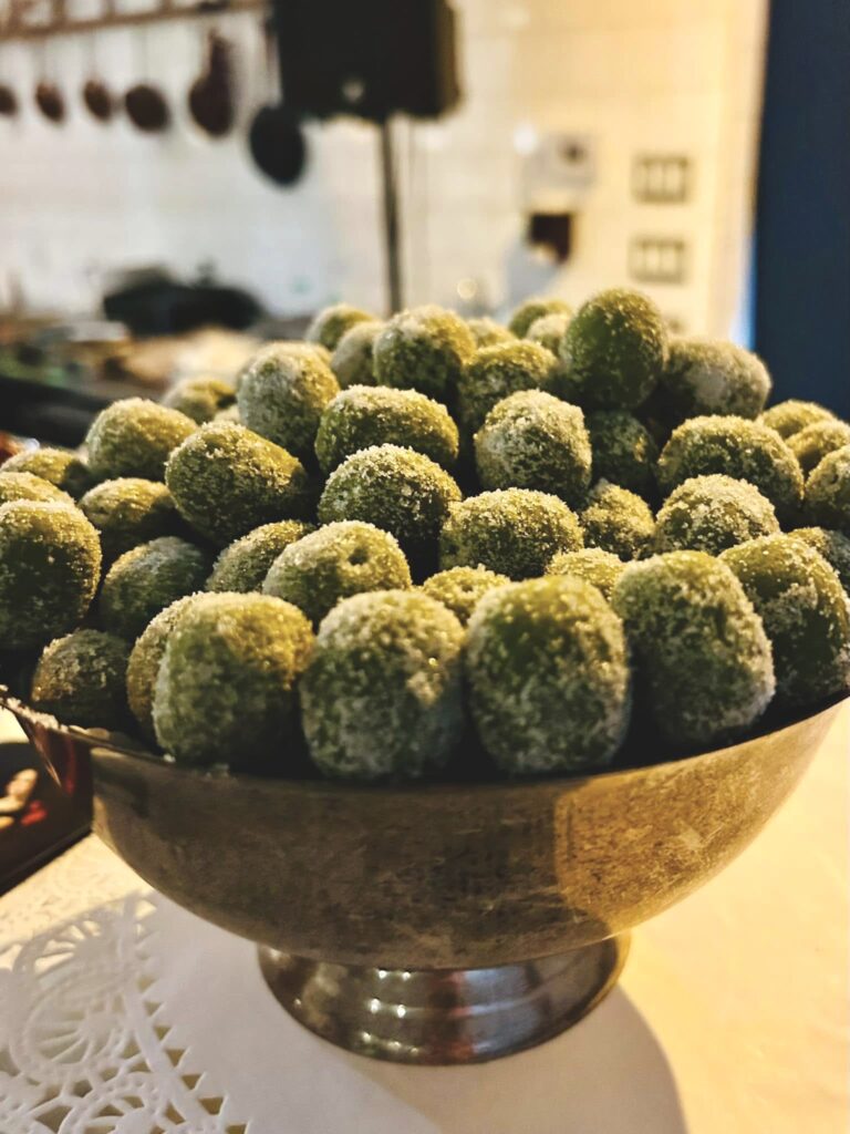 Celebratory confections also include Olivette di Sant’Agata (Saint Agatha’s Little Olives). The olivette as their name suggests are small, green, olive-shaped sweets. They are made from marzipan, sugar and green food coloring and are often enjoyed alongside the minne. Their shape is symbolic of the miracle of the olive tree.